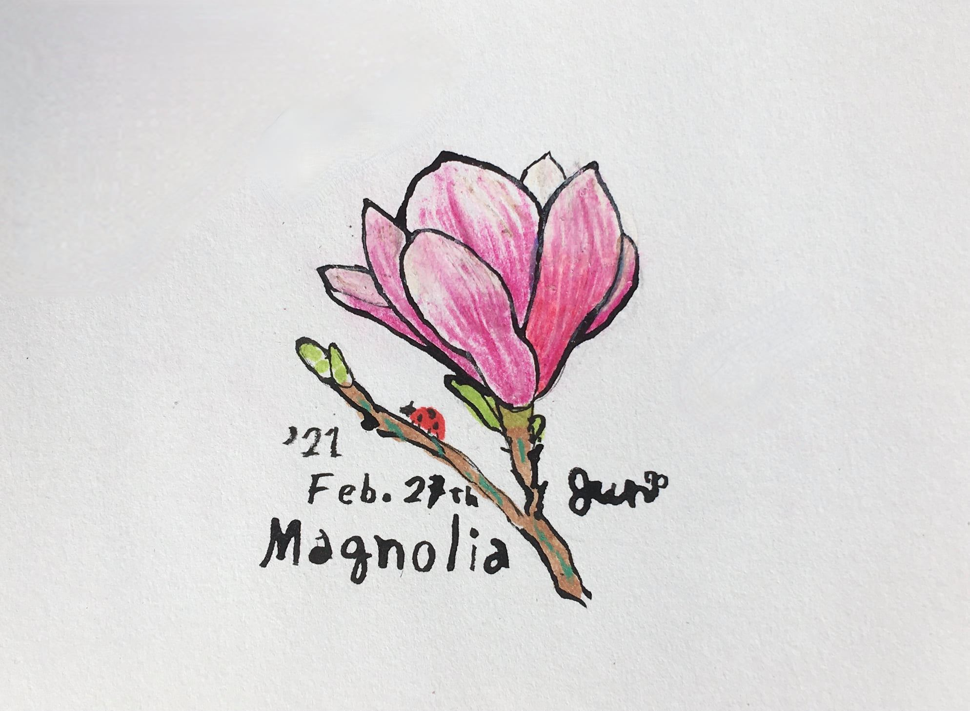 木蓮、学名:Magnolia liliiflora 落葉低木で開花期は、3月から4月です。「マグノリアの花たち」の映画で有名ですが、これは、常緑高木のタイサンボク(大盞木)のようです。