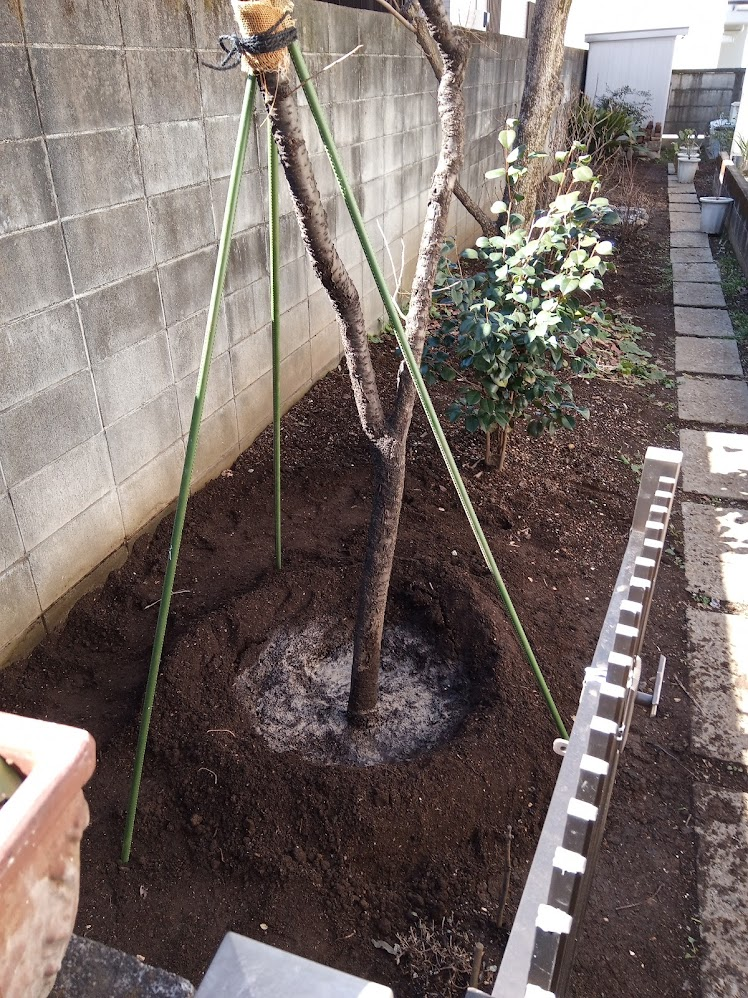 ガーデニング2年生の苗木を 植えてから10年ほど経過した寒緋桜の移植を行いました。このような場合、周りの状況が完全に掘り取れる場所に植わっていた場合を除き、移植する前年の冬1月に根を切って新根を出させる作業を行う必要があります。普通は新しい植木を購入する方が多いのですが、どうしてもその木を持っていきたいという場合は樹種と季節しだいでご相談やお手助けが可能です。