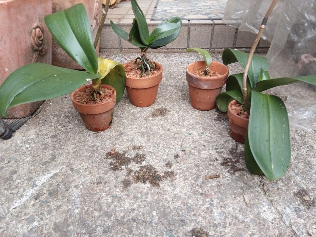 胡蝶蘭の植え替えのデモンストレーションです。二株は葉は健全ですが根が腐っています。他の二株は根は健全ですが葉が腐りかかっています。胡蝶蘭は、原産地では立ち木に寄生して生きておりますため、大きな鉢にまとめて植えずに、写真のように植木鉢はプラスチックではなく通気性のよい素焼きの極めて小さなものを使います。腐った根を取り除いて新しいミズゴケで植えなおしたうえ、最低2年は丁寧に年世話をしないとならないでしょう。でも、再び花が咲いたときの喜びはとても大きなものです。もし贈り物でしたら送り主に知らせたらどれほど喜ぶことでしょうか、何よりの返礼になります。それに新たな趣味の開拓になるかもしれません。ご興味のある方はどうぞお問い合わせください。