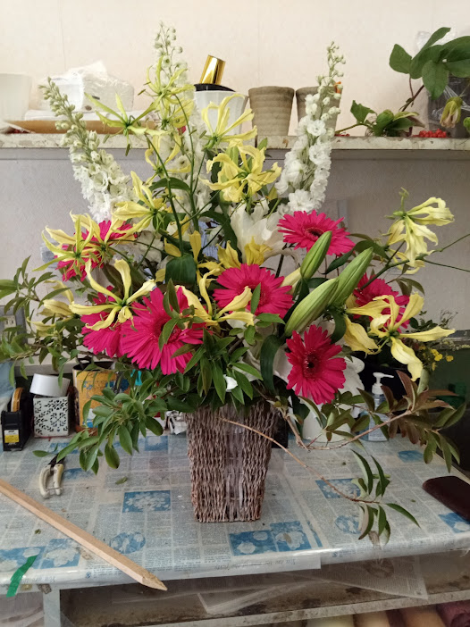 一般に20,000円以上の予算ですとスタンドという派手めな飾りを注文される方が多いのですが、スタンドは搬送と引き取りで二重手間になり、寄贈者の名札なども大きくなり、規模が大きくないとコストパフォーマンスに難があります。また、画廊等芸術的雰囲気には似合わない場合もございますので、今回の場合ご予算等考え合わせてアレンジフラワーといたしました。