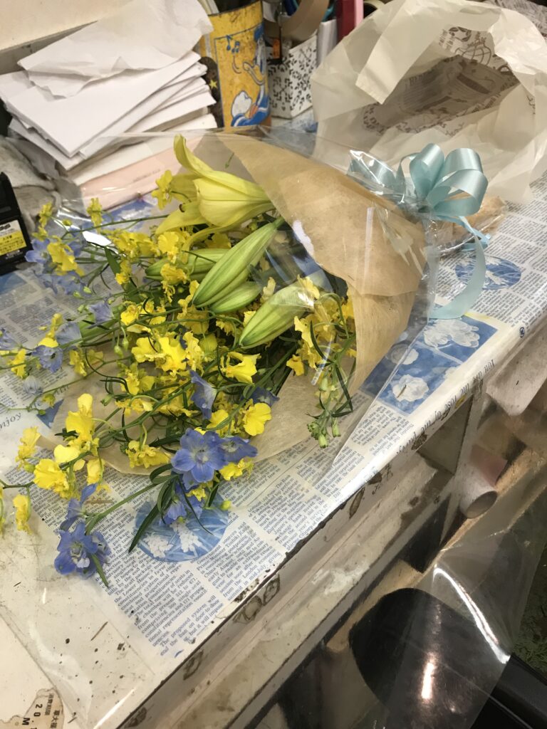 昇格祝いの花束 花束 X Facebook はてブ LINE コピー 2022.10.27 税込みで3000円の花束です。おめでとうございます。デルフィニウムとオンシジウムでとの希望に対して華やかさと喜びを出したいとユリを一本入れて作りました。 お問い合わせ