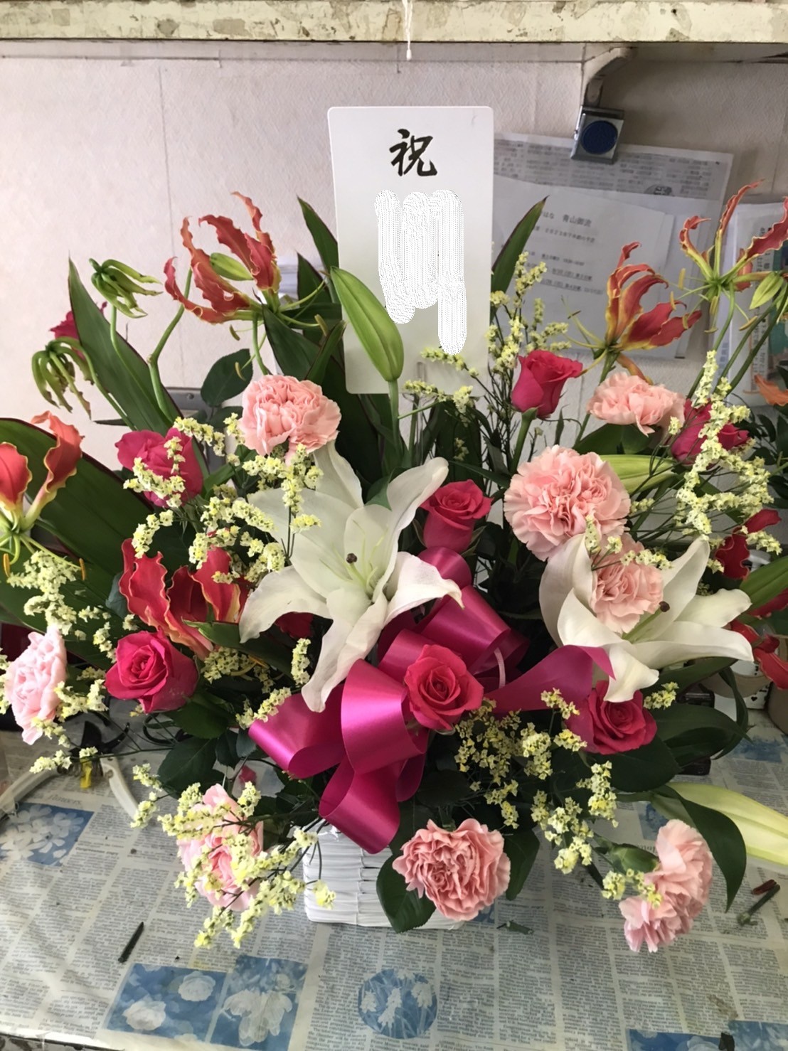 これはお祝い事のアレンジフラワーです。切り花としては立派な舞台です。勤めを終えた後は誰かに引き取られて寿命を全うすることを願っています。税込み1万円です。